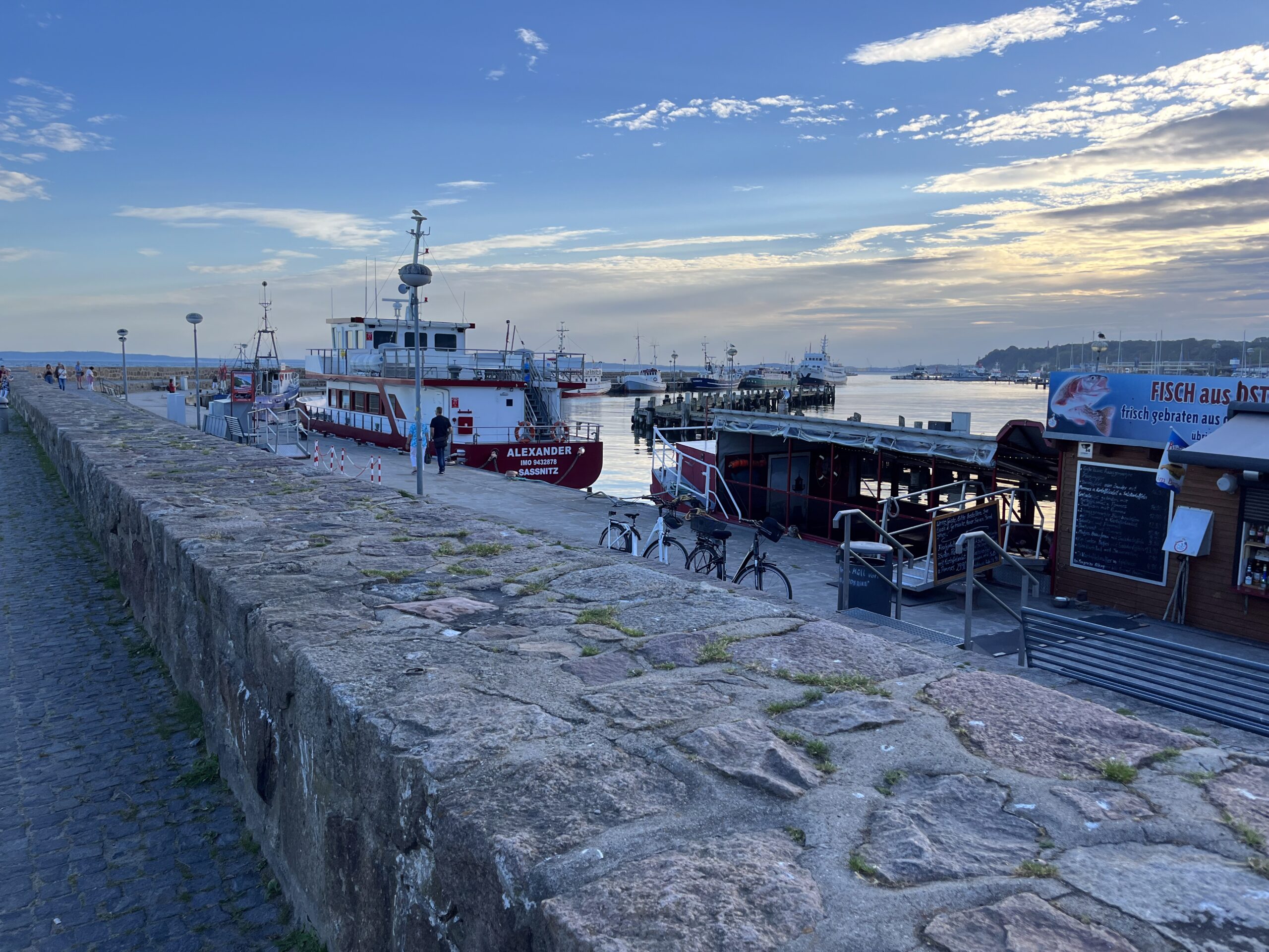 1444 m misst die Außenmole, die den Sassnitzer Hafen vor der doch auch mal rauen Ostsee schützt. Los geht sie am Molenfußgebäude und endet am grün-weißen Molenfeuer. Für die etwas Wagemutigeren gibt es einen Weg "außen" entlang. Alle mit Sicherheitsbedürfnis können innen laufen und den Blick über die Stadt, den Hafen und die Ostsee genießen.